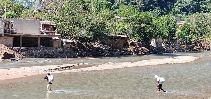 Mientras el nivel del agua ha disminuido, hombres, mujeres, jóvenes y niños deben cruzar el río y caminar 20 minutos para cargar en ayates los víveres que llega por parte de personas solidarias. Pero, ante cualquier nueva lluvia, la comunidad queda sin otra vía de salida y corre el riesgo de quedarse incomunicada.