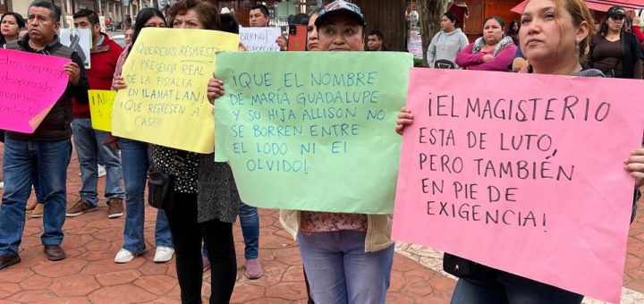 El día de ayer maestras y maestros que trabajan en las comunidades de la zona, marcharon del salón Palma Gacha al parque Hidalgo exigiendo la aparición de las maestras María Guadalupe Hernández Hernández, Lucinda Hernández Dominguez, Ancelma Ramírez Hernández y la menor Allison Guadalupe Morales Hernández.